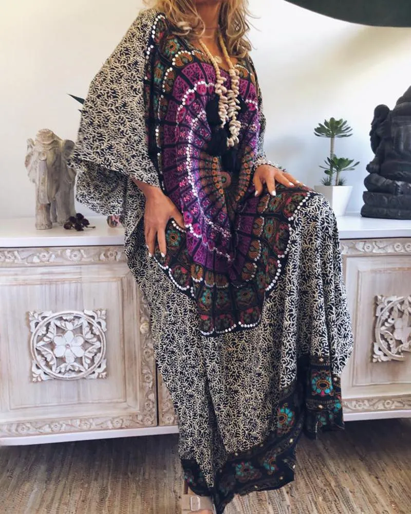 【Ship in 24 hours】Vintage Floral Print Batwing Sleeve Plus Size Maxi Dress